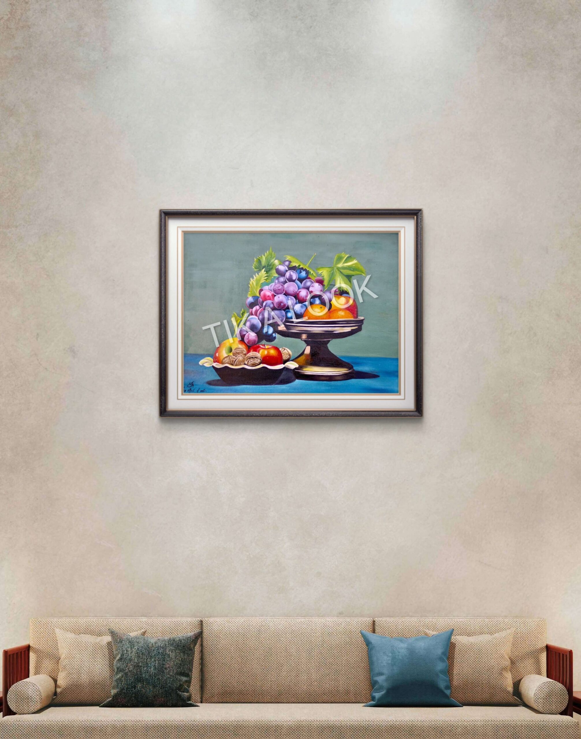 Resting in quiet balance, a selection of fruits is arranged with deliberate harmony — grapes cascading gently, apples grounded in stillness, citrus glowing with restrained warmth. The composition speaks softly, yet with depth, inviting the viewer into a moment of calm where nothing moves, yet everything lives.