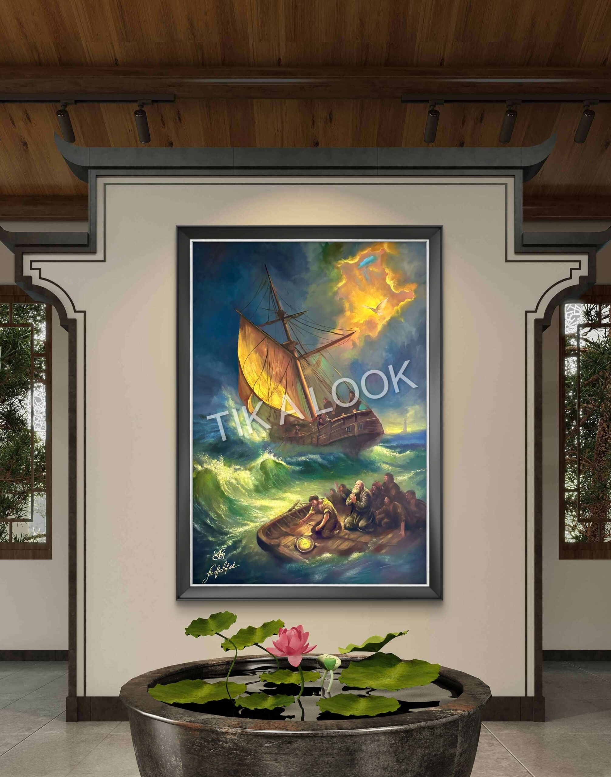 This painting is not merely a maritime scene; it is a spiritual allegory — a reflection of humanity navigating suffering while guided by faith, purpose, and unseen mercy. The contrast between darkness and light, struggle and serenity, makes this work timeless and deeply contemplative.