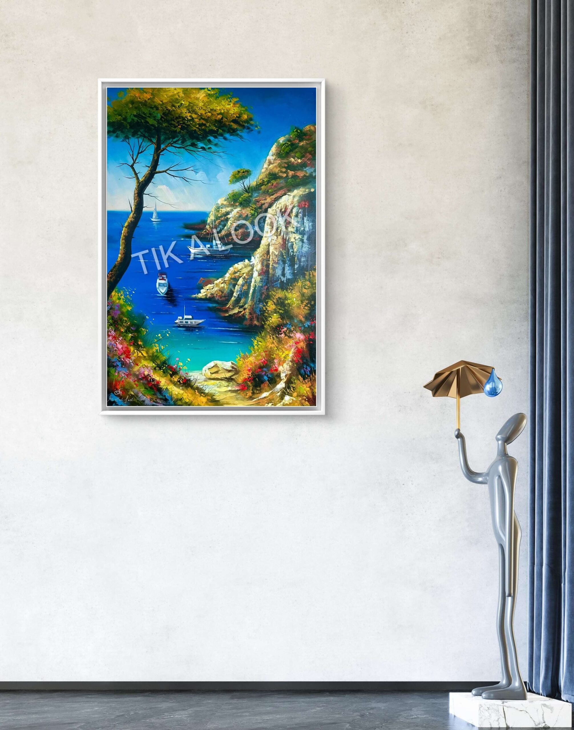 A tranquil coastal passage unfolds between sunlit cliffs and deep blue waters, where anchored boats drift gently in a state of calm suspension. The composition guides the eye inward—past flowering edges, rugged stone, and reflective sea—toward a horizon that feels both intimate and infinite.
