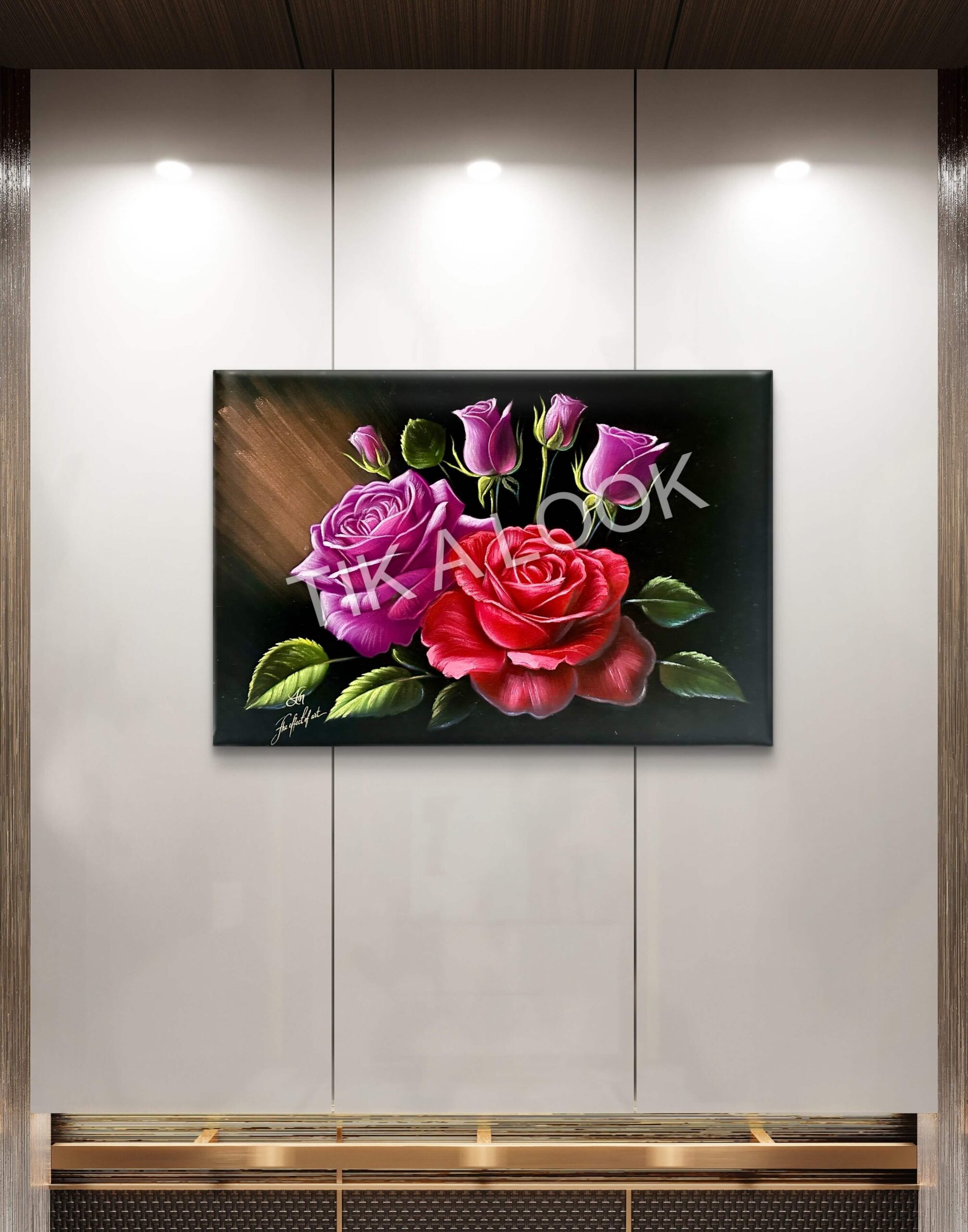 The red rose carries intensity, devotion, and lived experience, while the violet rose offers introspection, grace, and calm awareness. Together, they form a quiet harmony where passion is balanced by reflection. The velvet surface deepens the background, allowing color and form to rise with subtle authority.