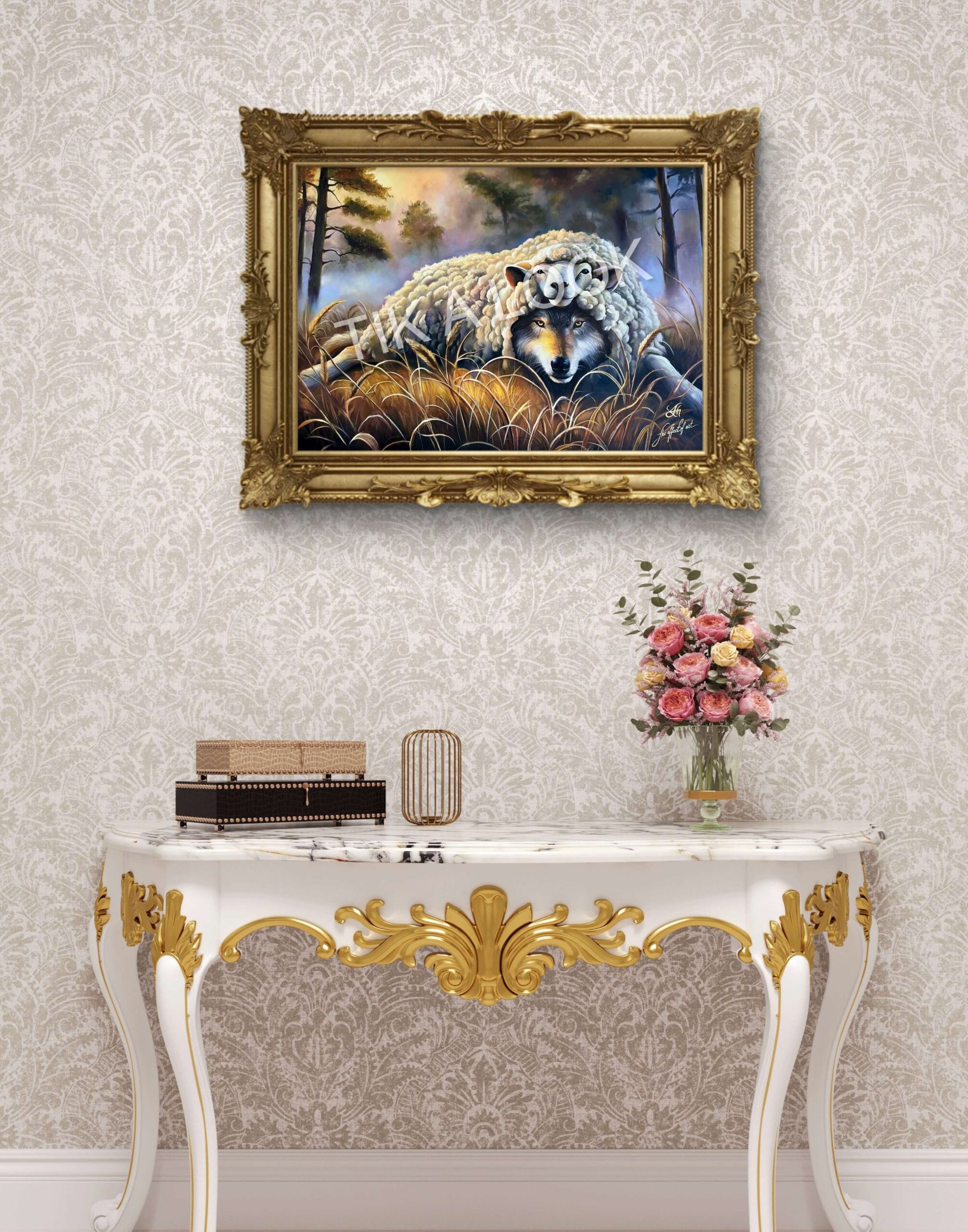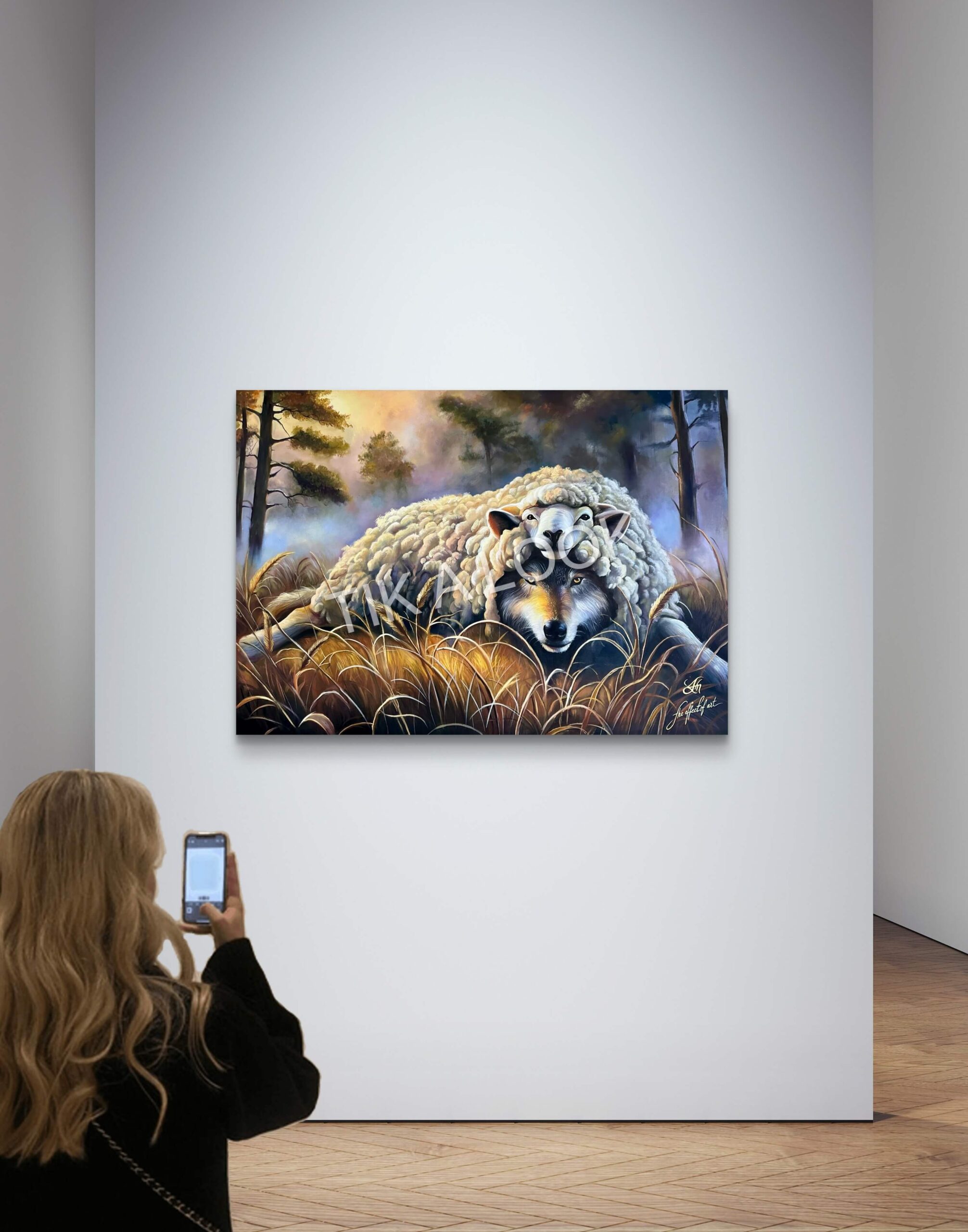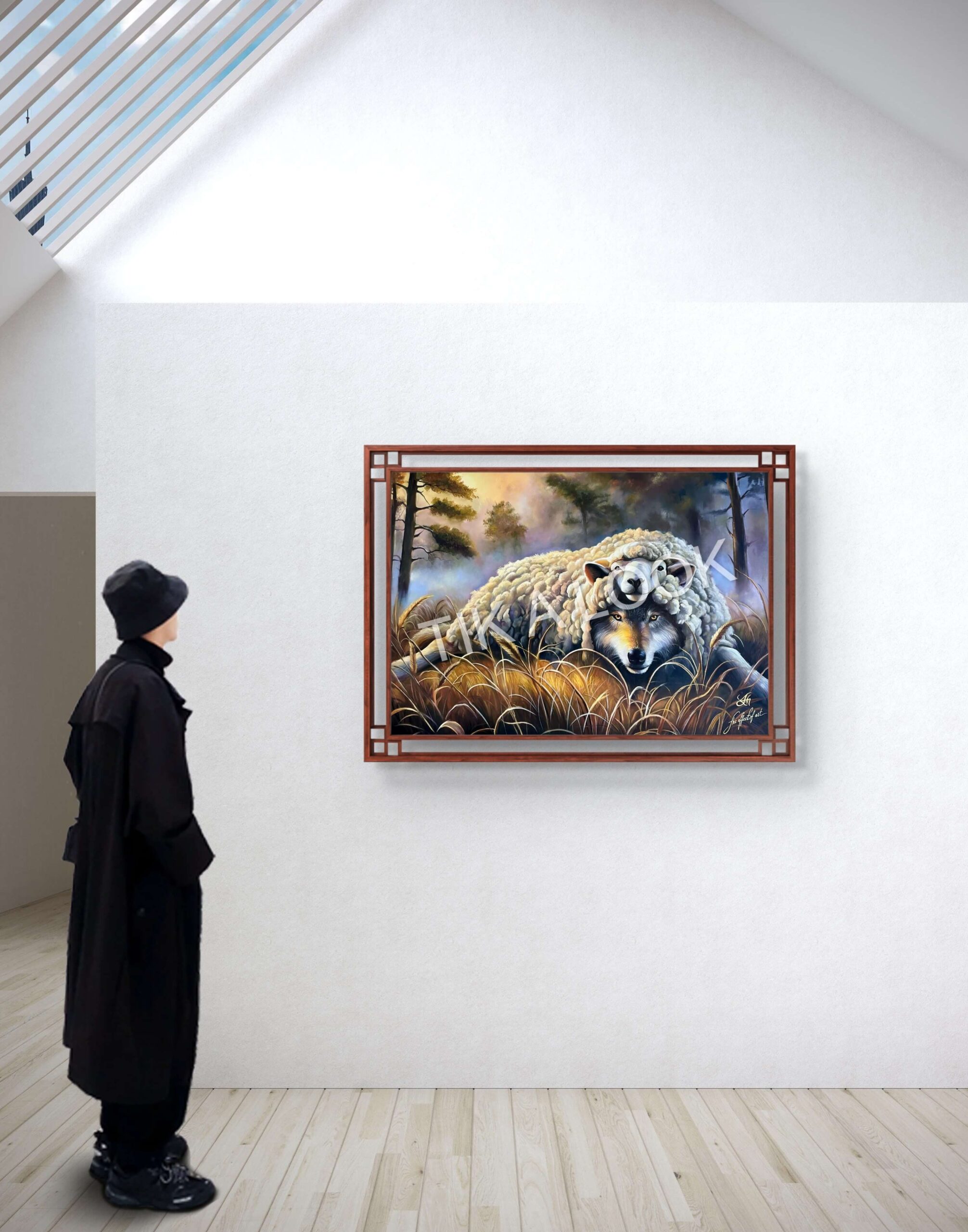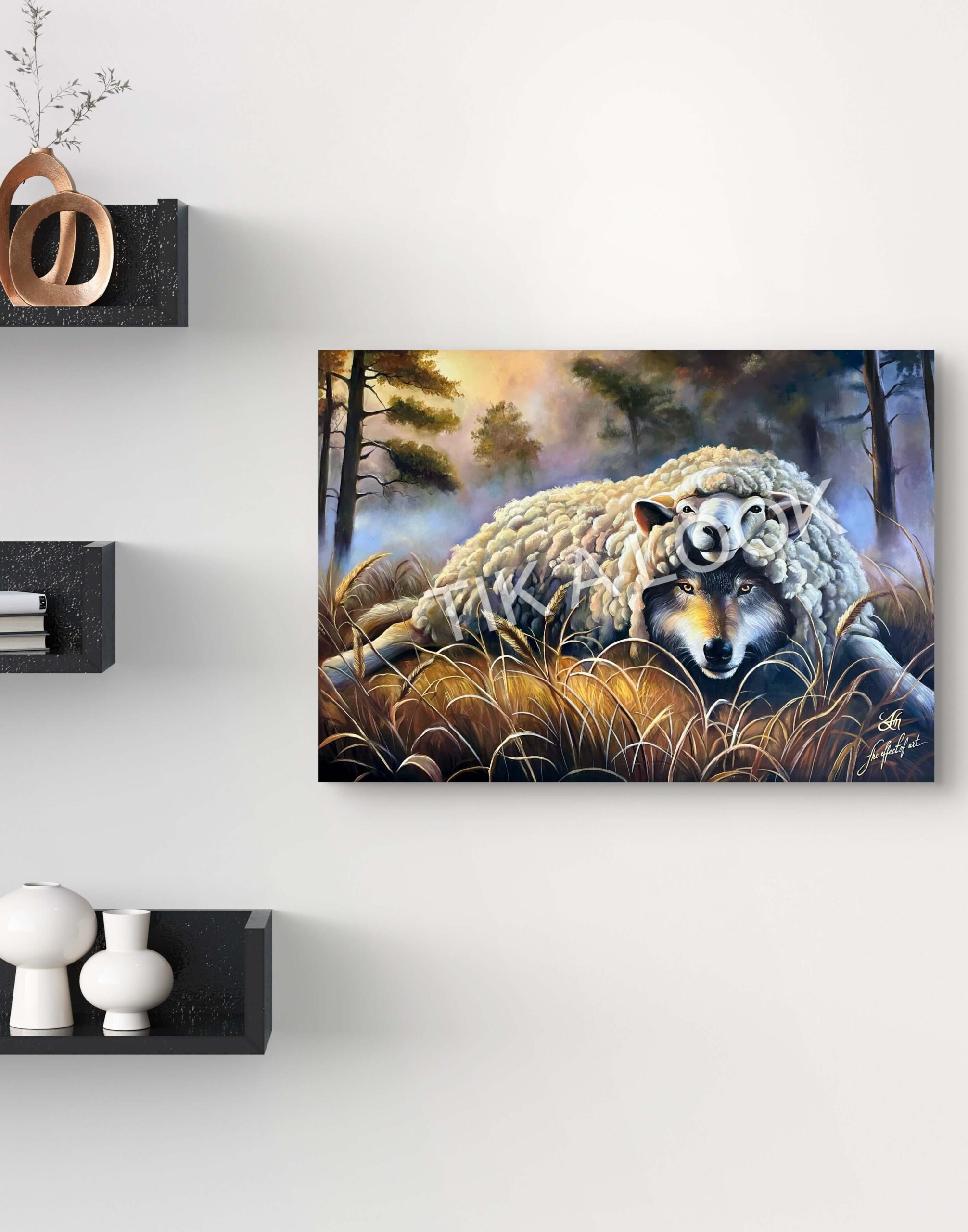 This original oil painting reveals a quiet yet unsettling truth concealed within calm beauty. At first glance, a gentle sheep rests peacefully among tall grasses, its presence soft and reassuring. Yet beneath this tranquil exterior, a wolf gazes outward—alert, aware, and patient. The contrast is deliberate, powerful, and impossible to ignore.