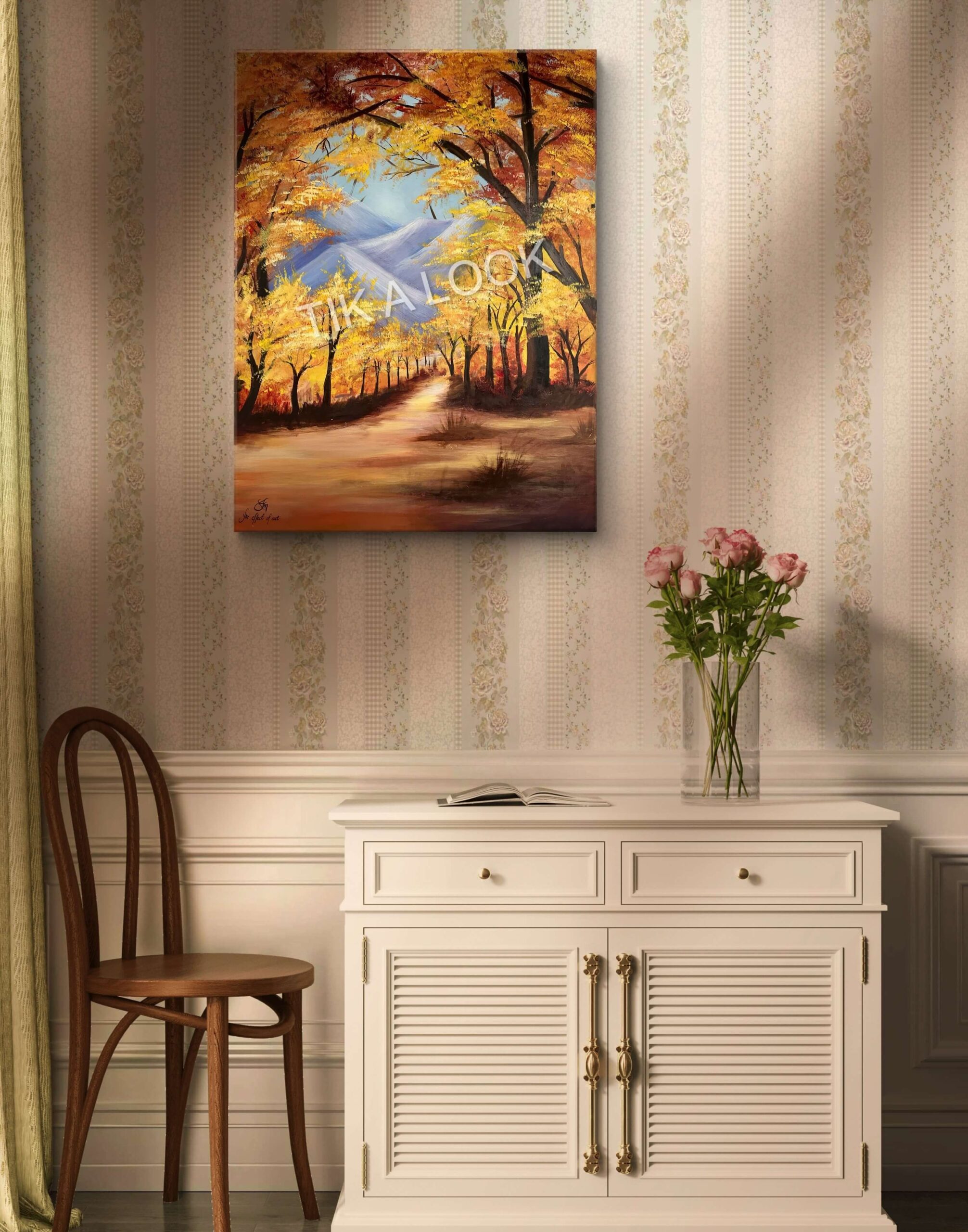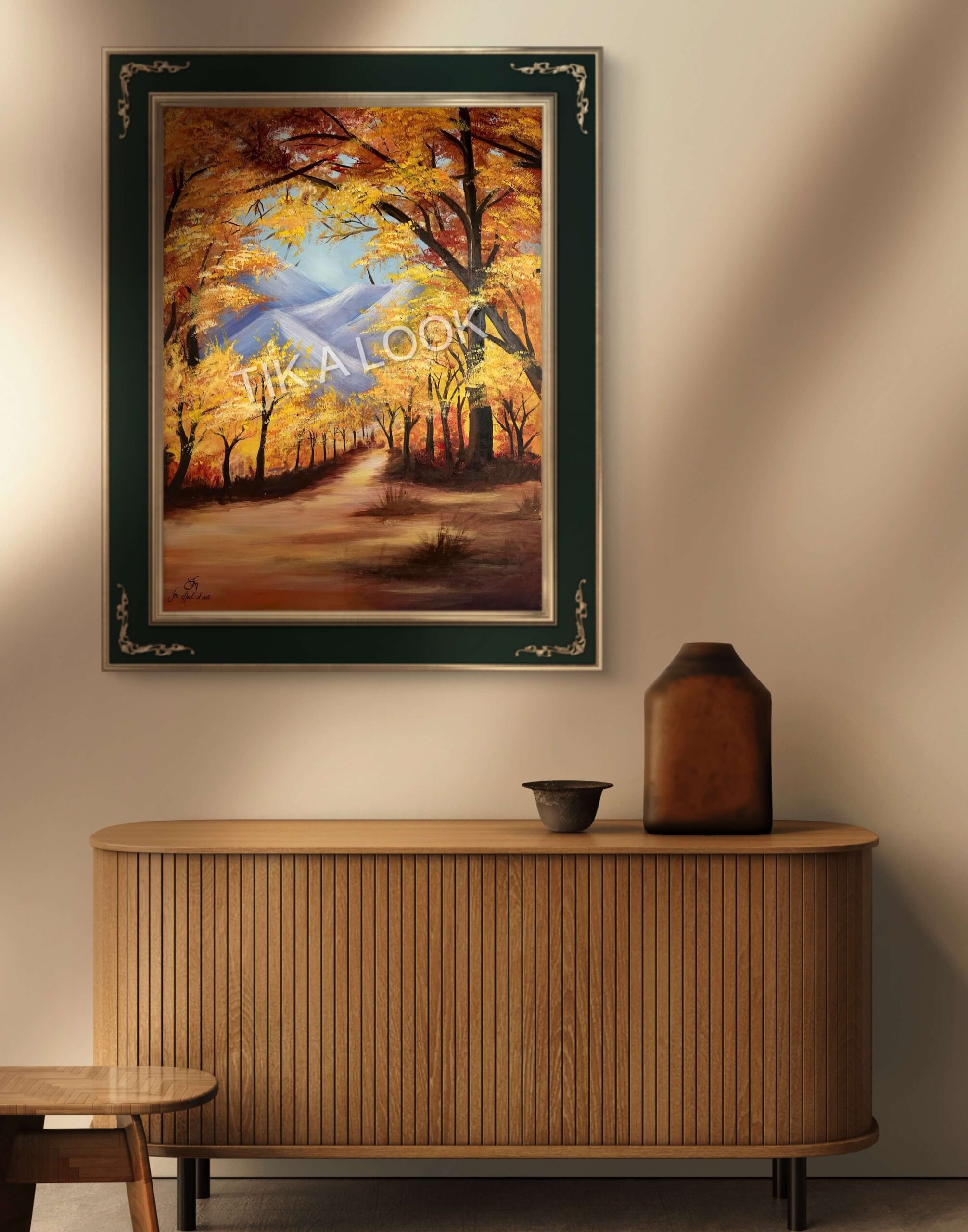 This original oil painting opens onto a tranquil path framed by autumn’s warm embrace. Golden leaves arch overhead like a natural cathedral, guiding the eye toward distant mountains softened by light and air. The road moves gently forward, inviting reflection rather than haste.