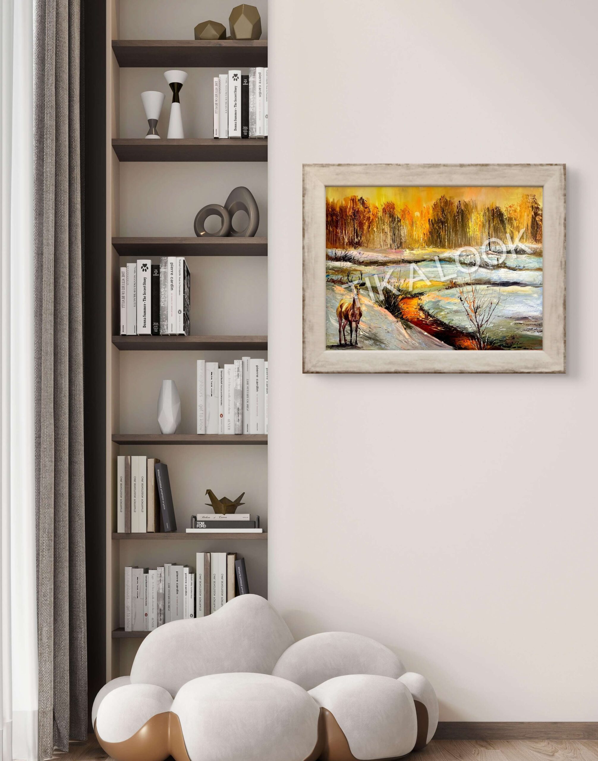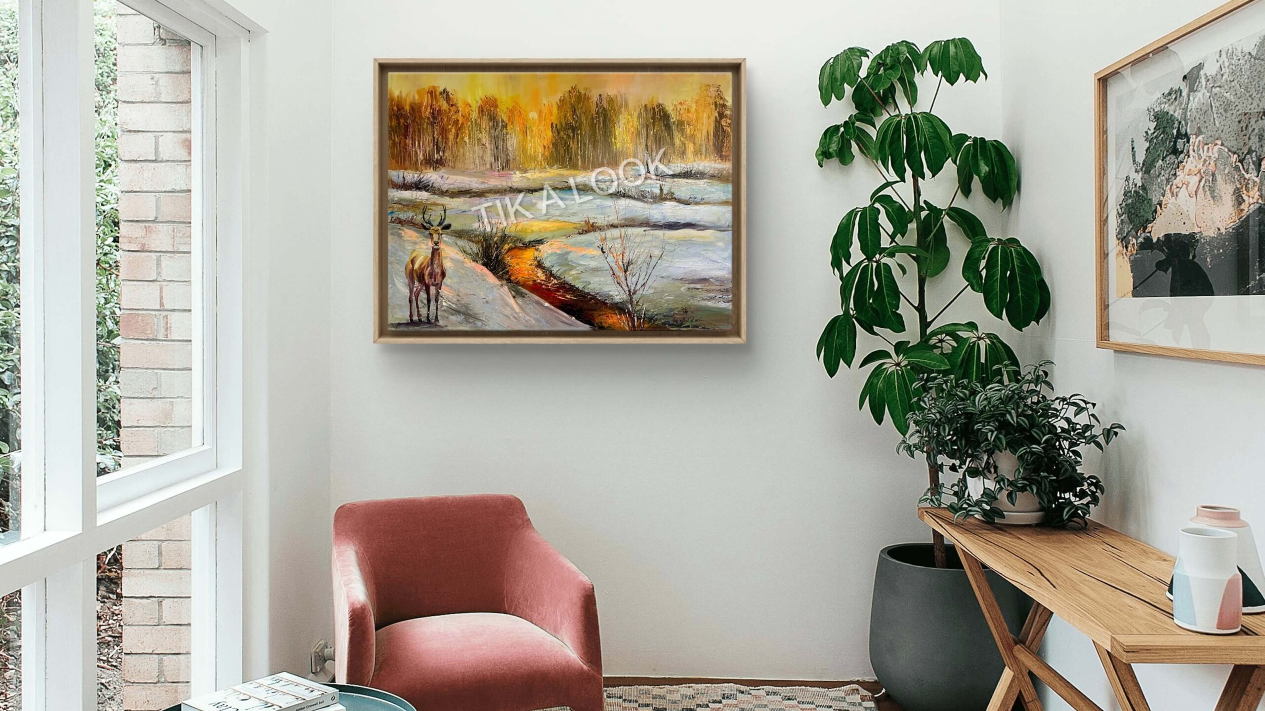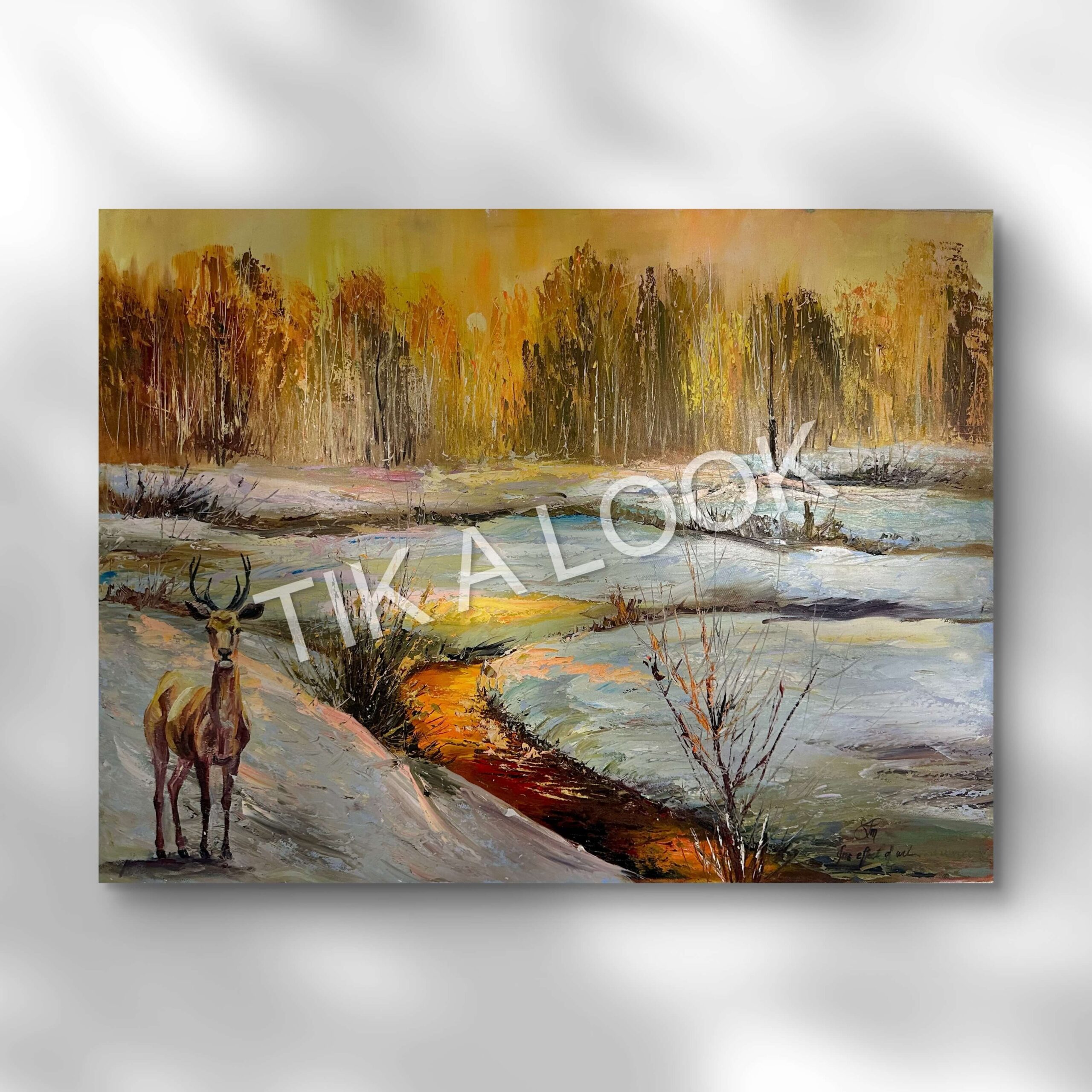 This painting captures a moment of awareness rather than action. The stag does not flee, nor does it advance. It stands—alert, composed, and present—watching the landscape as it shifts between seasons. The frozen ground begins to release its hold, allowing warmth to surface beneath pale remnants of winter.