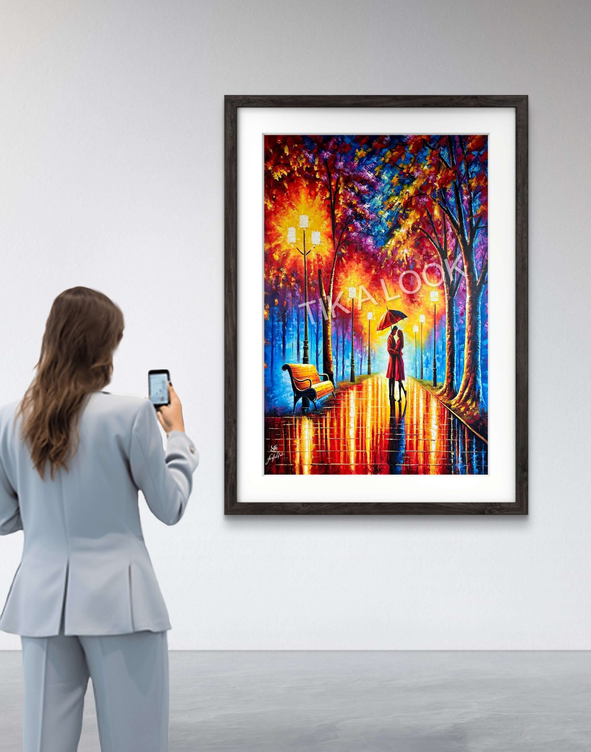 This painting captures love not as spectacle, but as presence. The umbrella becomes a quiet shelter, the lamps stand as witnesses, and the mirrored path reflects the inner world shared between two souls. Time slows here; noise fades. What remains is connection.