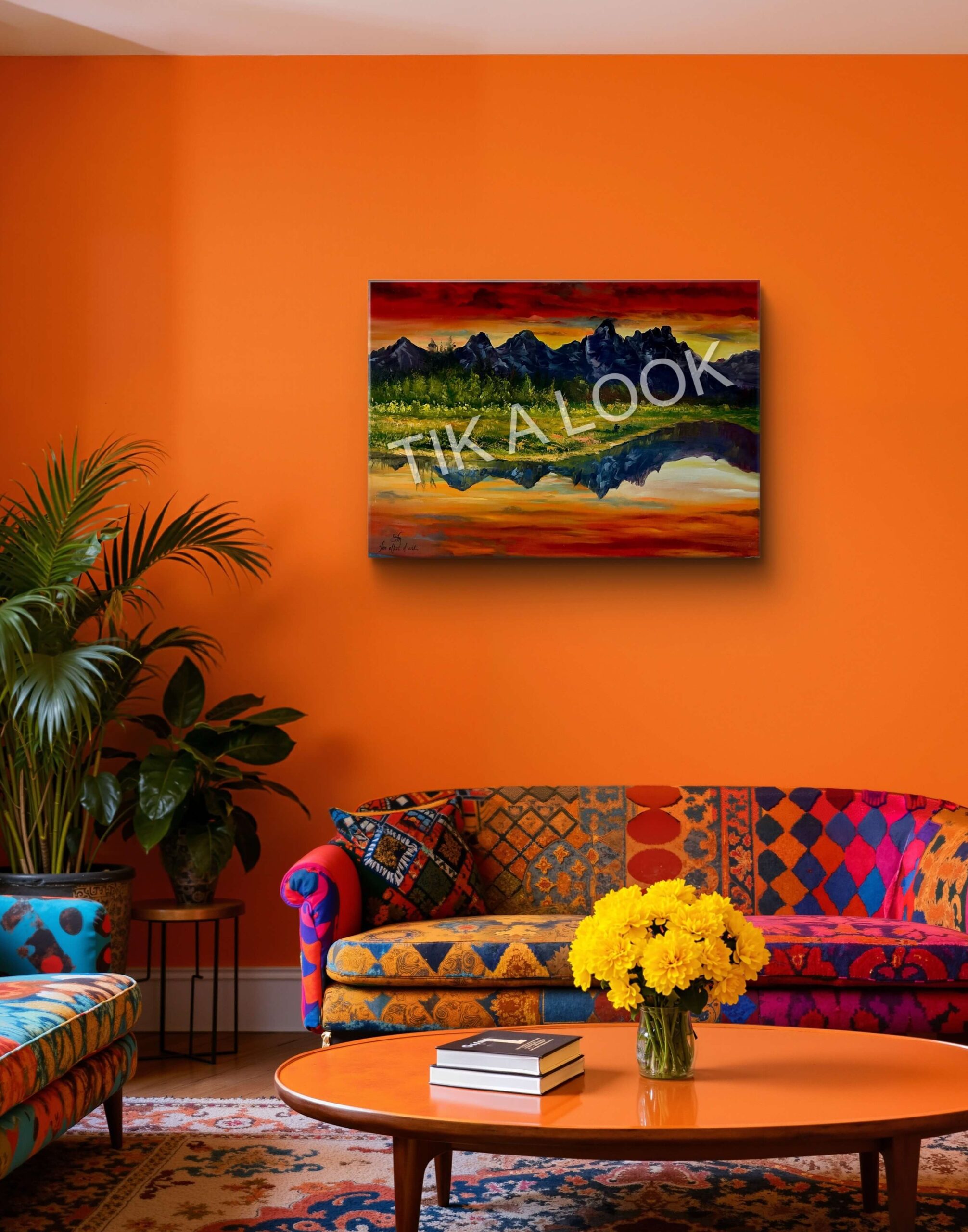 At the heart of the composition, calm water reflects the landscape with absolute honesty. This reflection represents the inner self—untouched by noise, clear, and deeply aware. Between the fire above and the mirror below lies a band of living green, symbolizing life itself: growth, hope, and the brief moment we are given to exist consciously between beginning and end.